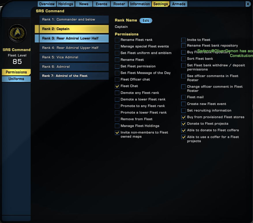 Everyone in every SRS fleet has an armada rank. This rank should now be worn on your uniform. For example, if you are a Captain in the SRS Armada then you should reflect that on your uniform. The rank of Fleet Admiral given to you by the game is a nonsensical rank when considered as a fleet of officers. If you are an individual then STO is all about you and it may well be the case that you are a Fleet Admiral. Within the actual SRS Fleets though, like many other fleets, you should wear your rank insignia which matches your actual real armada rank, which is earned through hard work and determination. Chiefs of Staff have the Armada rank of Admiral. Commander in Chief has the rank of Fleet Admiral. There are limitations in the game with regard to rankings, we have to work around that structure as best we can. Officers seen with the wrong rank on their uniform will be questioned by Section 47, be warned.
